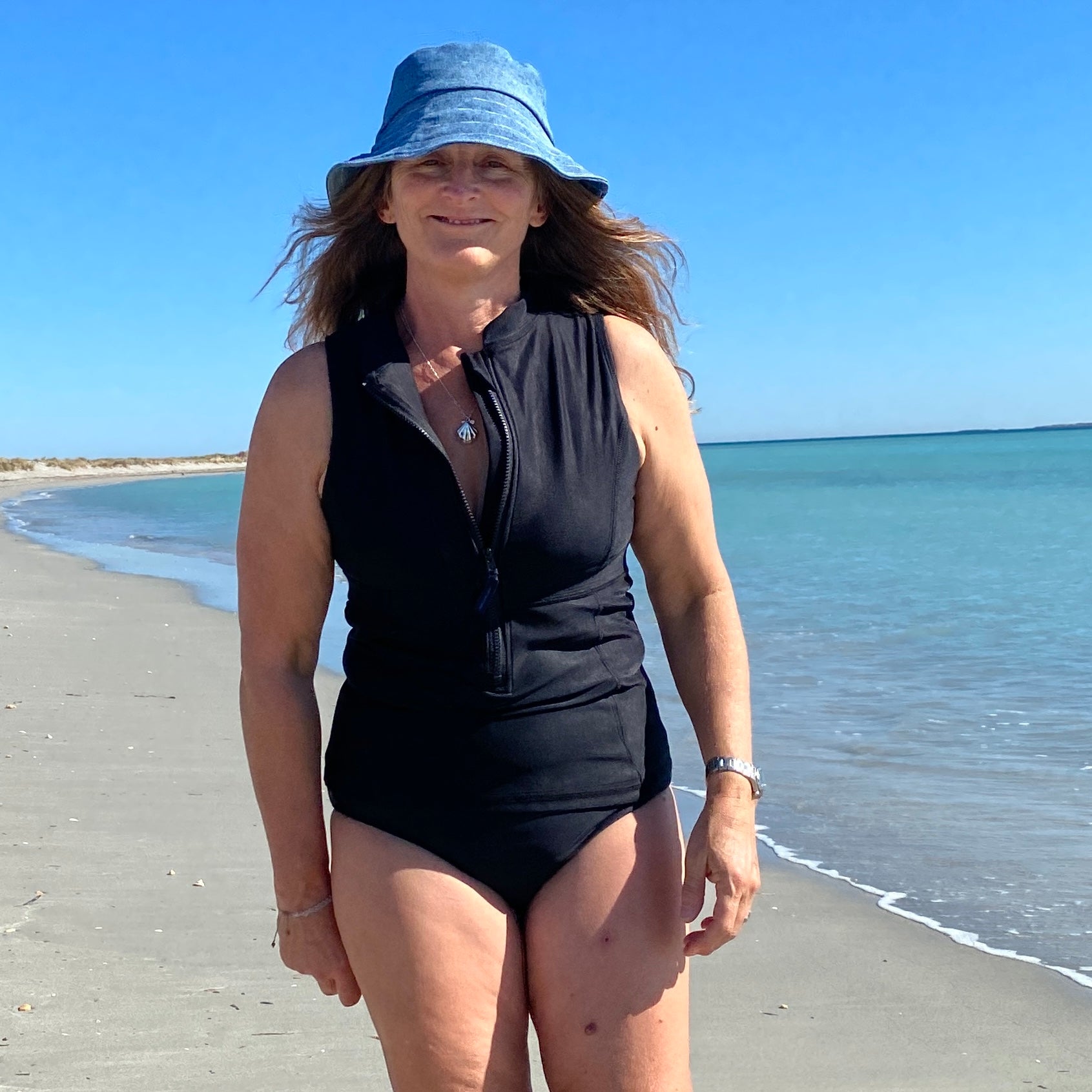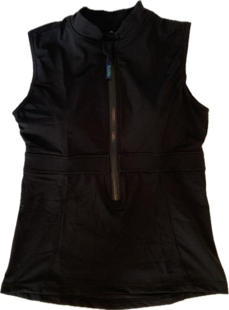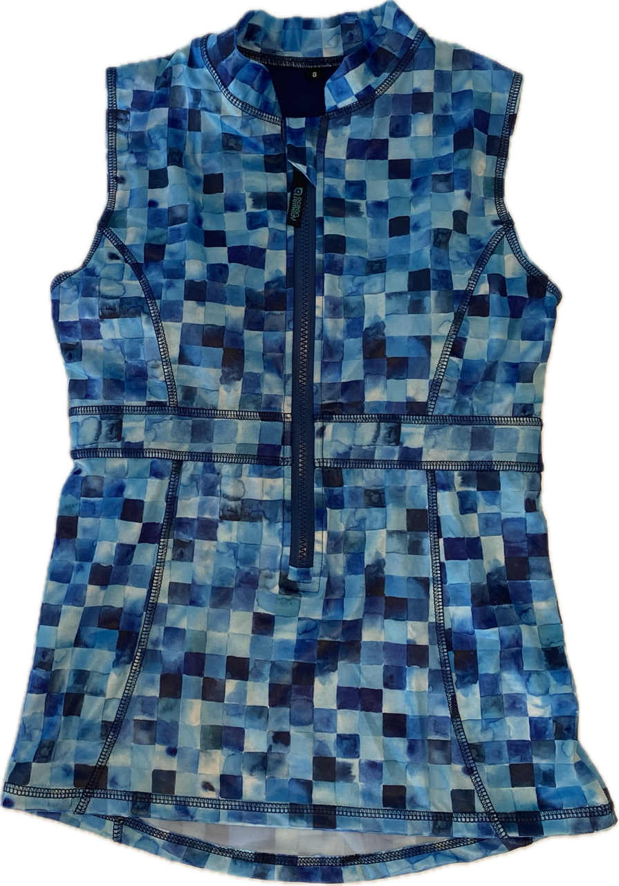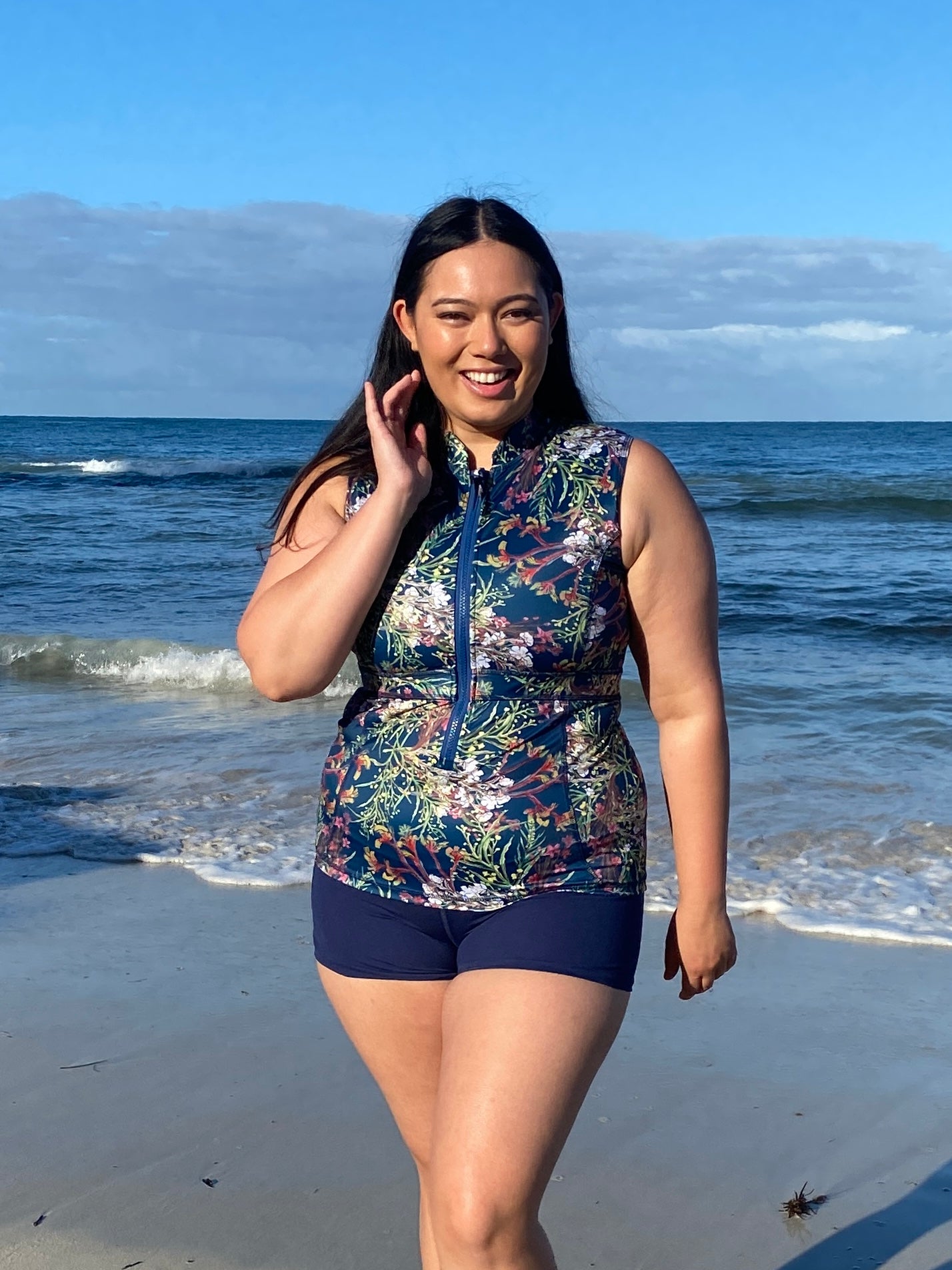 Function and form in a stylish swim vest! A little bit retro and a whole lot beautiful, supreme comfort and confidence feature in this women's sleeveless swim vest. Crafted with love from either printed chlorine resistant Repreve Recycled Polyester, or block colours are in Ultra Chlorine resistant Recycled Polyester Carvico Sydney fabric. Zip up front, with elastic support, Suits AA-E cup. The cup can also accommodate removable foam cups or a prosthetic swim breast if needed. Full coverage front, and back. Where this swim vest sits when you put it on, is where it stays.